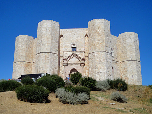 Als ich kurz vor acht Uhr aus dem Hotel trat und das Gepäck ans Velo montierte merkte ich sofort, dass es heute nicht so heiss war wie gestern und dass ein angenehmer Wind wehte. Zuerst kaufte ich in einem Lebensmittelgeschäft frisches Wasser und ein paar Sachen zu essen ein und dann machte ich mich auf den Weg in Richtung Castel del Monte (UNESCO-Weltkulturerbe).