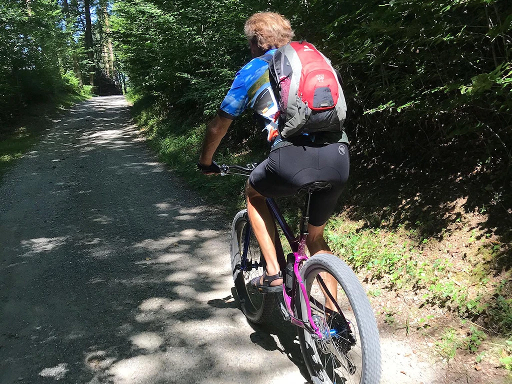 Peter hatte sich eine recht anstrengende Strecke ausgesucht. Ein erstes Mal fuhren wir hoch auf den Pfannenstiel, weil wir die tollen Trails runter durchs Meilemer Tobel fahren wollten und wenn man da unten angelangt ist, muss man halt alles wieder zurück. Das heisst nochmals von 400 auf 850 Meter über Meer. Wir wählten eine neue Strecke, die zwar ziemlich direkt, dadurch aber auch fies steil war. Die Oberschenkel begannen da hoch doch ziemlich zu brennen...