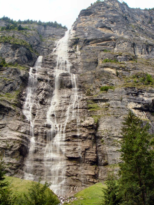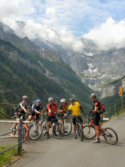 Wir fahren danach auf einfachen und eher langweiligen Schotterstrassen bergrunter Richtung Gimmelwald und Stechelberg, bevor wir in Rüti die Talsohle erreichen. Das macht nichts, so haben wir auch mehr Zeit, die schöne Umgebung zu geniessen. Unten im Tal geht es dann nur noch etwa 10 flache Kilometer zurück nach Lauterbrunnen. Wir fahren dabei direkt unterhalb von Mürren durch und können mehrere Wasserfälle bewundern, die diesen gelwaltigen Felsabhang herunterstürzen. Das ist wirklich sehr eindrücklich und hat mir gut gefallen.