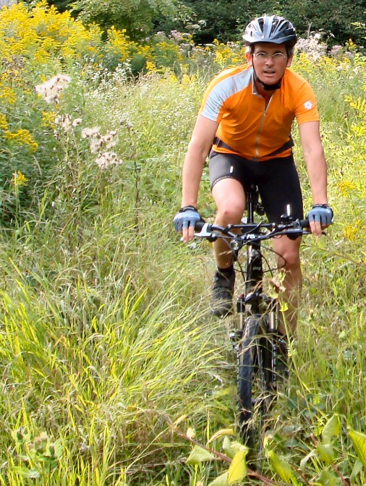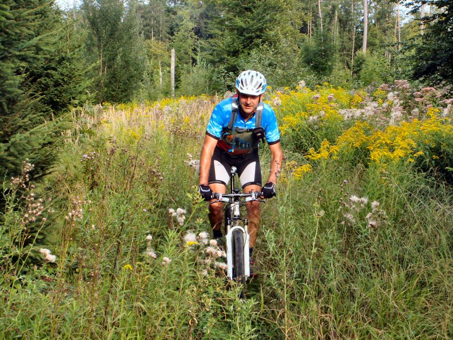 Auf der Anfahrt zu den Lägern versuchten wir einen neuen Weg und landeten plötzlich in wilder Natur! Hohe Gräser, kleine Büsche. Ein ganz schmaler Pfad führte auf die nächste Forststrasse. Sehr schön. Wir fühlten uns wohl und so fuhren wir recht forsch in die erste richtige Steigung. Normalerweise fahre ich da an der steilsten Stelle im 2.kleinsten Gang. Heute drückte ich den 4. Gang hoch und fühlte mich noch ganz o.k. Als wir später auf den Hauptweg einbogen nahm ich mir vor, dass ich heute alles im mittleren Kettenblatt hochfahre. Es war die einzig ernsthafte Steigung des Tages, ich kenne jeden Meter aus bestimmt schon über 100 Fahrten und ich fühle mich fit. Also los. Der Puls geht hoch, auf über 170 Schläge, ich fahre wirklich am Anschlag, doch es geht. Jürg fährt locker nebenher.