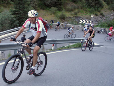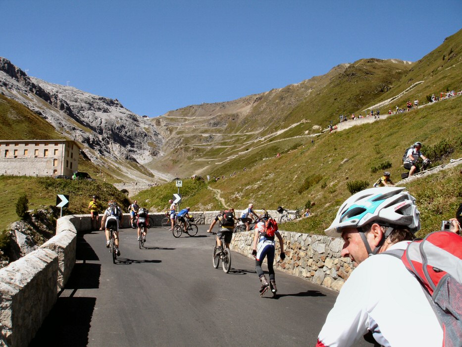 Bei Peter gab es dann noch einen Kaffee sowie seine Bilder von gestern. Zusammen haben wir etwa 50 Fotos gemacht und so die Stilfserjochtour gut dokumentiert. Zwei seiner Bilder -von mir- haben mir besonders gut gefallen und deshalb will ich sie hier noch zeigen. Auf dem Bild links sieht man bis zum Pass hinauf. Vor mir fährt ein Inlinescater (super!). Das Bild gibt einen guten Eindruck des gestrigen Geschehens. Rechts dann zu Beginn der Steigung ein Bild, welches irgendwie recht dynamisch wirkt. Zudem lächle ich, und mache (noch) nicht so einen leidenden Eindruck... schön. Danke für die gelungenen Aufnahmen.