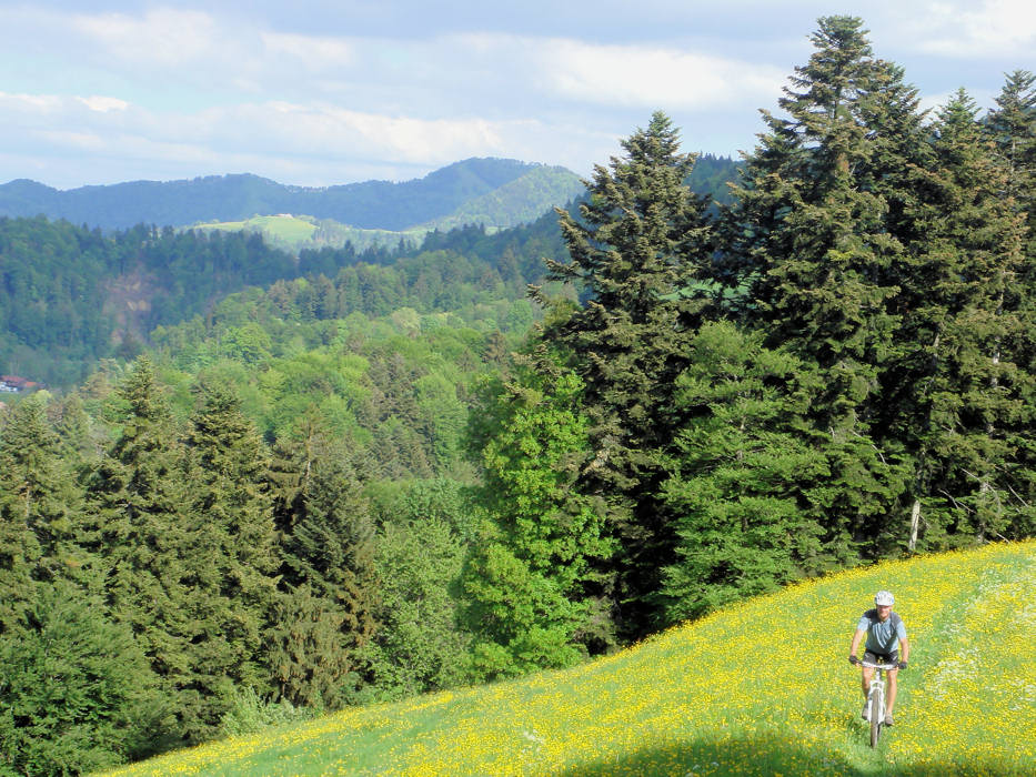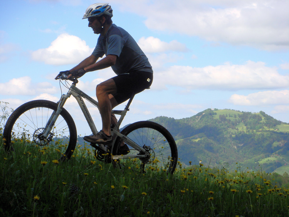 Zuoberst auf dem Hügelzug lichtet sich der Wald und wir stehen unvermittelt vor einer wunderschönen Blumenwiese. Und nicht nur das. Eine Grillstelle, mit Tisch und zwei Bänken, gekrönt mit einer herrlichen Aussicht. Ich hatte Hunger und wir machten eine Essenspause und genossen die Umgebunng. Da mussten wir dann unbedingt die Fotos des Tages machen. Auf dem Bild rechts sieht man die schöne Wiese. Die höchste Erhebung im Hintergrund ist das Schnebelhorn. Auf dem Bild rechts sieht man im Hintergrund das Hörnli. Ja, das Zürcher Oberland ist wirklich schön. Eine super Bikegegend.