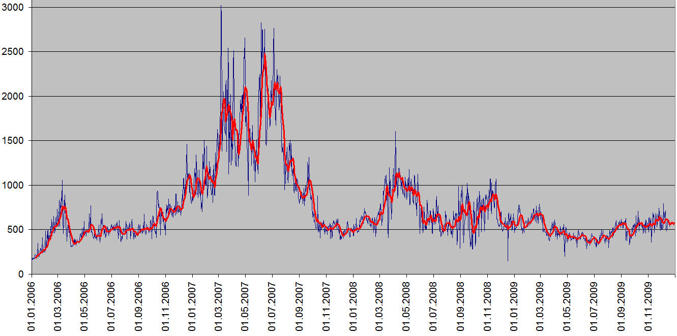 Die Besucherstatistik zeigt die Entwicklung vom Start im Dezember 2005 bis heute. Die Spitzenwerte kurz vor und während dem Gigathlon 2007 stechen besonders hervor. Von da weg liess das öffentliche Interesse mehr und mehr nach. Im laufenden Jahr lagen die Treffer ziemlich konstant bei etwa 500 Hits pro Tag. Bei 95% Suchmaschinentreffern bleiben etwa 25 natürliche Personen, die im Schnitt meinen Blog lesen. Immer noch lesen. Danke dafür! ![]()