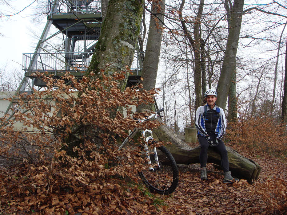 Schon an der ersten Steigung musste ich anhalten und etwas Kleider ausziehen und im Rucksack verstauen. Für 5° Grad plus war ich zu warm gekleidet, auch das Stirnband brauchte es heute nicht. An der zweiten Steigung musste ich erneut anhalten, dies jedoch, weil nun Regen einsetzte und ich die leichte Regenjacke überziehen wollte. Beim Irchelturm machte ich noch kurz das obligate Standardfoto.