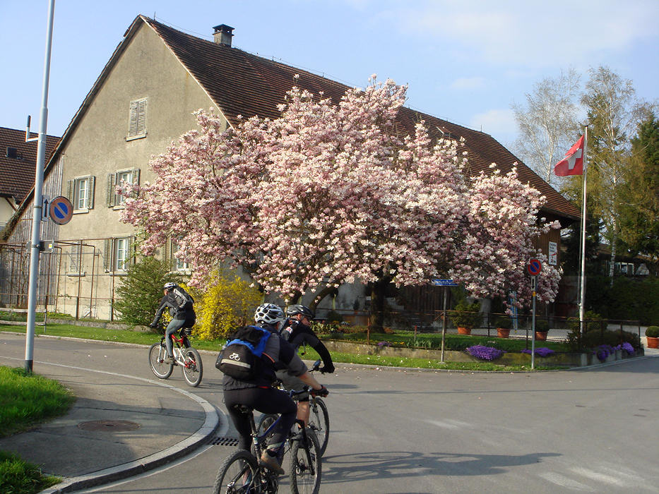 Am Morgen war es noch ziemlich kühl und diesig, doch der Wetterbericht versprach einen schönen Tag mit Temperaturen bis gegen 17° Grad. So zog ich heute das erste Mal in 2010 kurze Radhosen in Kombination mit Knielingen an. Der Boden war trocken und super gut fahrbar. Soweit also perfekte Bedingungen. Wenn da nicht die Sache mit den Fahrverboten wäre und dem Umstand, dass es an einem schönen Samstag natürlich mehr Spaziergänger und Wanderer hat, als an einem Donnerstag. Wir hatten aber Glück und bis auf eine oder zwei kurze Diskussionen gab es keine Probleme.