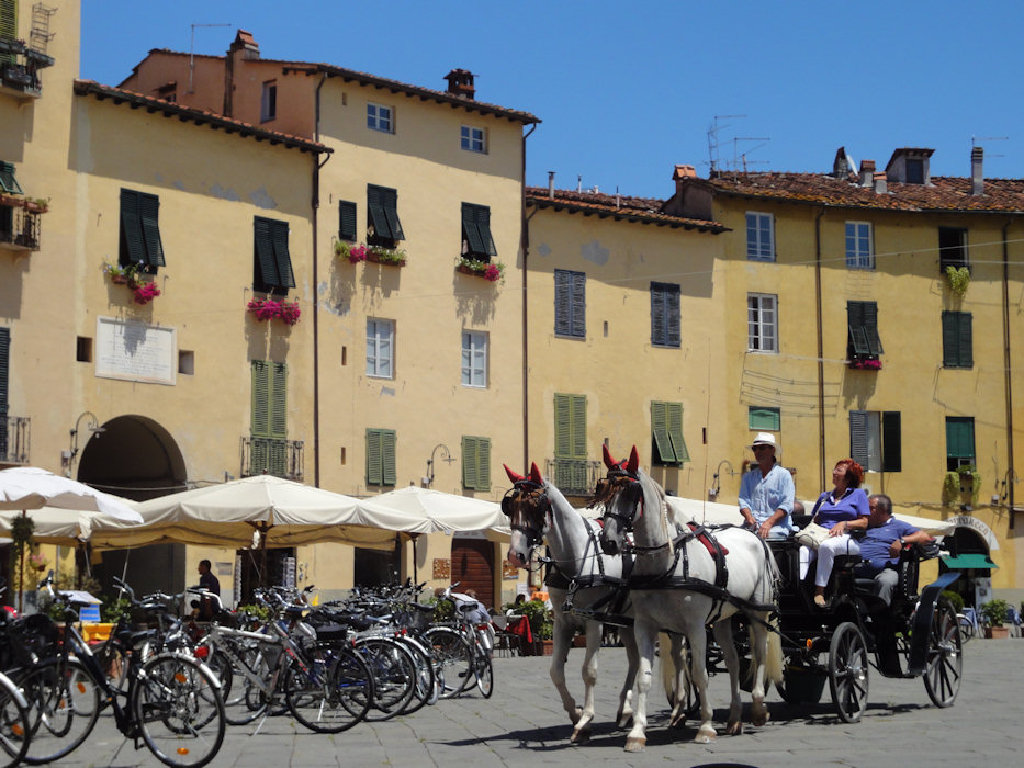 Es war also von Beginn weg klar, dass ich heute nicht in die Berge zurück fahre, sondern eine Flachetappe fahren werde. Nach Lucca waren es knapp 50 Kilometer und diese führten entlang des Flusses Sarcchio fast ausschliesslich bergab. Von etwa 250m.ü.m runter bis etwa 20m.ü.m. Dabei geriet ich mitten in ein Velorennen von der Art, wie ich Anfang April in Cervia ebenfalls an einem teilnahm. Die Spitzengruppe hatte ein beachtliches Tempo drauf und nach und nach kamen immer langsamere Gruppen. Kurz vor dem Besenwagen war dann eine grössere Gruppe kaum schneller als ich und ich hängte mich mitsamt meinem Gepäck an. Das war lustig. Vor mir alles leichte Karbonrennräder mit Fahrern, die wie Profis gekleidet waren und zuhinterst ich, mit 20 Kilo Gepäck als Radtourist. Zugegeben, bergrunter merkt man fast nichts vom Gepäck, denn wenn es mal rollt, dann rollt es. Kurz vor Lucca bogen die Fahrer an einem Krisel ab, wo die Spur nach Lucca gerade aus ging, da verabschiedete ich mich. Danke für etwa 15 Kilometer Windschatten.