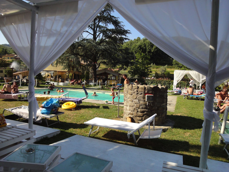 Nach Montecatini Terme zurückfahren wollte ich nicht mehr, also fuhr ich auf der Bergrückseite runter und hielt Ausschau nach einer Unterkunft. Und siehe da, nach etwa 10 Kilometern wurde ich fündig. In einem kleinen Vorort von Serravalle di Pistoia erspähte ich ein schön gelegenes Albergo mit Pool und zugehöriger Pizzeria, das war genau das Richtige für mich war. Der Preis inklusive Frühstück war 50 Euro, was ich o.k. fand. Ich verstaute das Gepäck im Zimmer, duschte und wusch die getragenen Bikekleider.