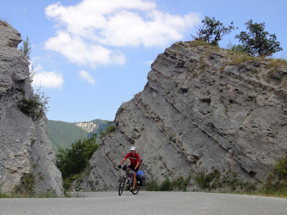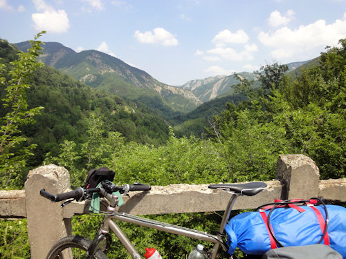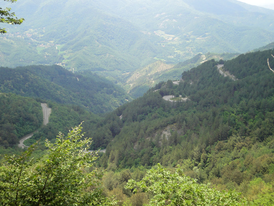 Ich wollte mir dadurch nicht die Laune verderben lassen, schliesslich war ich satt, das Wetter war sehr gut und die bevorstehende Fahrt durch den "Parco Nationale Foreste Casentinesi, Monte Falterone Campigna" motivierte mich. Zuerst musste ich wieder die 10 Kilometer bis nach San Benedeto in Alpe hochfahren, wo ich dann gleich einen Halt im kleinen Lebensmittelgeschäft machte um mich mit Proviant für den Tag einzudecken. So kann ich wieder ein paar Euro sparen. Danach stieg die Strasse bis auf etwas über 900 m.ü.m. an wo ich mir im Bergrestaurant dann doch noch einen Cappuccino gönnte. Die Aussicht war herrlich und man konnte gut die Strasse sehen, auf welcher ich dann knapp dreihundert Höhenmeter runter fuhr um bei der nächsten Abzweigung wieder in einen Anstieg zu wechseln um ein zweites Mal die 900er Grenze zu erklimmen.