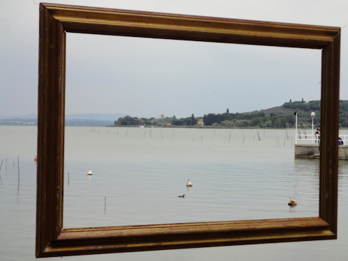 So langsam dachte ich daran, ganz um den Lago di Trasimeno zu fahren, auch wenn ich keine Velohosen trug und auch das GPS im Zimmer liess. Ich stellte nämlich fest, dass es einen ausgeschilderten Radweg gibt, der abseits der Strasse sehr schön immer entlang des Seeufers führt. In San Feliciano legte ich dann einen meiner obligatorischen Cappuccinohalts ein und blickte in Richtung Isola Polvese. Bei schönem Wetter bestimmt noch eine Spur malerischer... Kurz darauf kam ich an einem aufgehängten Bilderrahmen vorbei, der sich natürlich für das Tagesbild förmlich anbot. Blöd nur, dass man bei gerader Sicht nur den See und das weit entfernte Ufer sieht, weshalb ich eine leicht schräge Fotografie bevorzugte (mit der Isola Polvese).