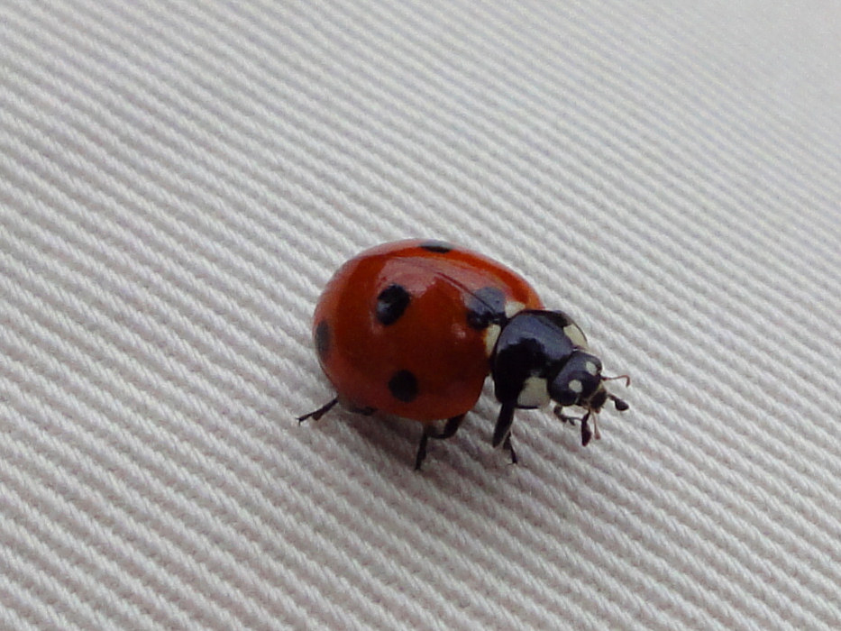Ich fuhr im Uhrzeigersinn dem Seeufer entlang und wollte eigentlich nicht weit fahren und dann in einem der Strandbäder einen erholsamen Ruhetag verleben. Doch auch heute unterschied sich Theorie und Praxis, denn die Bewölkung nahm weiter zu und an Baden war nicht mehr wirklich zu denken. Zu windig, zu kühl und ausserdem waren die Liegewiesen auch noch nass. Ich setzte mich einfach auf eine Parkbank und schaute etwas über den See. Da kam ein Marienkäfer angeflogen und setzte sich auf meine Hose. Ganz ruhig nahm ich den Fotoapparat hervor und machte ein erstes Bild.