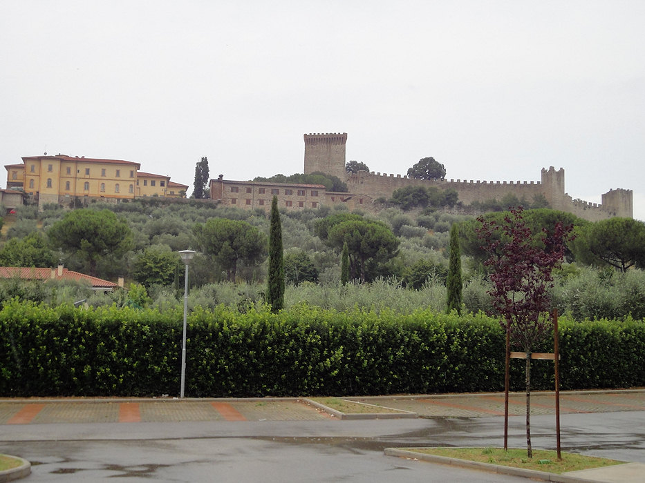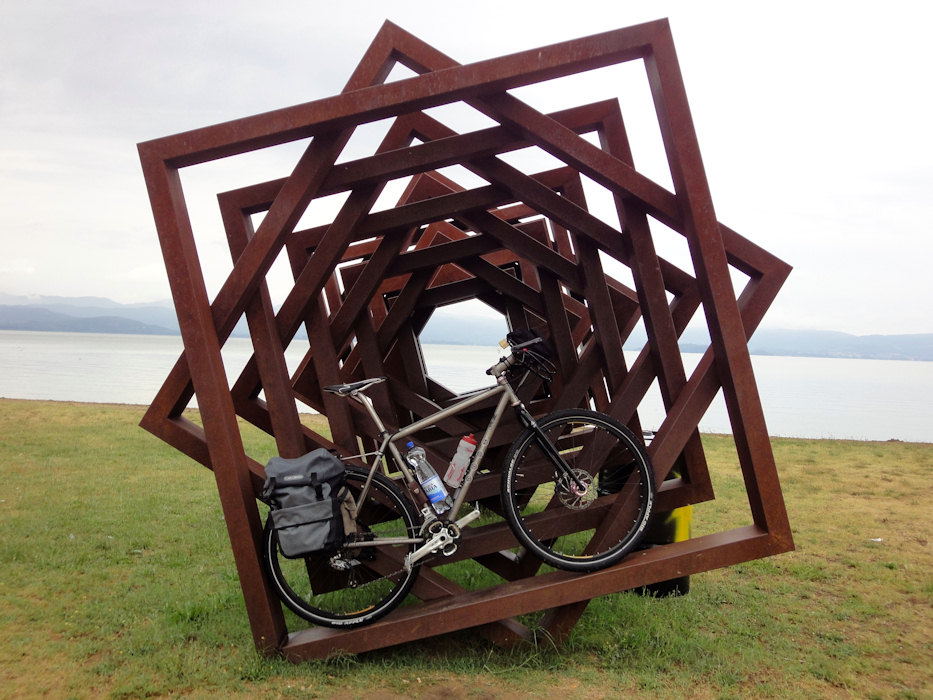 Wie es dann halt so passiert, begann es am ziemlich entferntesten Punkt zu regnen. Zuerst nur schwach, doch zunehmend so stark, dass ich wirklich froh war, meine Regenkleider mitgenommen zu haben. Unter einem Baum zog ich mich um und fuhr weiter bis nach Castilione del Lago. Die eindrückliche Burg musste ich natürlich fotografieren und auch eine kurze Ortsbesichtigung liess ich mir durch den Regen nicht verderben. Als ich zurück auf den Radweg fuhr, kam ich an einer interessanten Metallskulptur vorbei. Kurz das Bike hinstellen und nochmals knipsen...