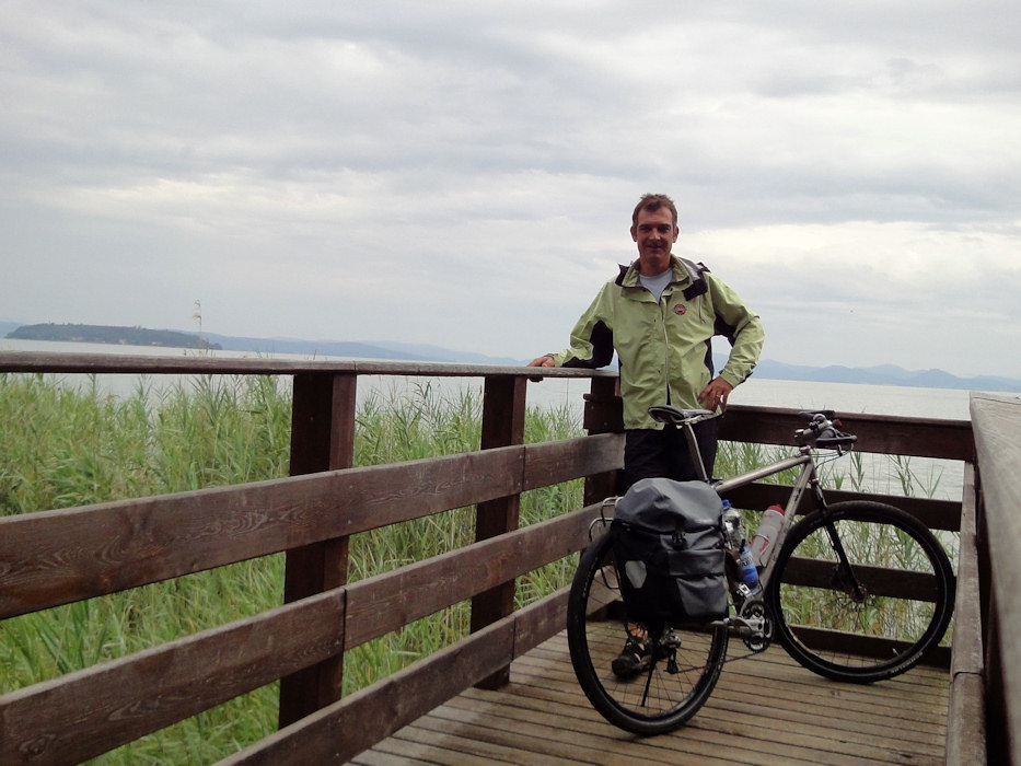 Das Wetter wechselte nun dauernd von trocken über leichten Regen bis zu Regenschauern. Eine kurze Regenpause nutzte ich für ein Foto mit Selbstauslöser, bevor ich dann am späten Nachmittag wieder nach Passignano sul Trasimeno zurückkam. Der Regen und die vielen Schotterstrassen sauten mein Bike kräftig ein und so war klar, dass ich nun noch etwas Bike putzen und pflegen würde, bevor ich mich im Hotelzimmer an den PC setze. Dieser Ruhetag verlief nicht ganz so, wie ich es mir vorgestellt hatte, doch lieber heute Regen, als Morgen, wenn ich nach Assisi fahren will. Auf wetter.com sah ich mir noch den Wetterbericht an und bin nun optimistisch, dass meine Reise trocken weitergehen kann. Das GPS blieb zu Hause, ich schätze 50 km, 3 Std., 100 Hm.
