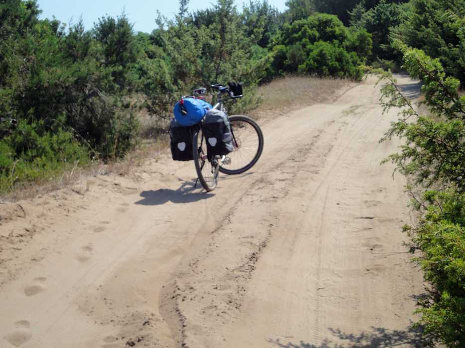 Natürlich war ich nicht zum baden hier sondern um Rad zu fahren, weshalb ich schon bald wieder im Sattel sass und der Küste entlang bis zur Porta Pietro Nero fuhr, wo die Küstenstrasse dann auf der Landseite um den Lago di Lesina führte. Ich hatte mir jedoch in Google Earth eine Schotterstrasse ausgeguckt, die zwischen dem Strand und dem Lago di Lesina entlang führte und regelmässige Leser beginnen schon zu ahnen, dass schon bald Ärger anstand.