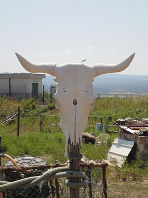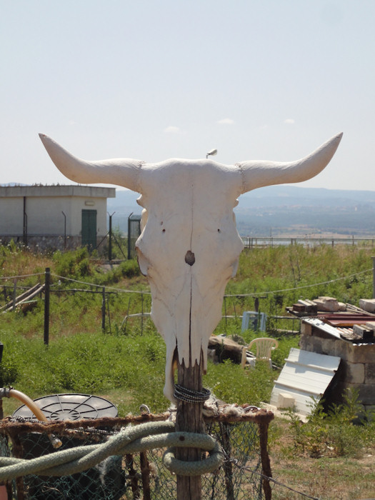Ich kann gerade noch die Fahrspur frei machen, als sie zwischen den Büschen auftauchen und johlend an mir vorbeifetzen, so dass ich in einer dichten Staubwolke stehe. Toll! Die haben sich bestimmt krumm gelacht. Irgendwann dachte ich, ich lege mich jetzt in den heissen Sand, rufe ein letztes Mal meine Frau an und dann verdurste ich ganz einfach. Von mir wird nur noch ein von Aasgeiern abgenagter Schädel übrig bleiben, wie von der Kuh im rechten Bild. Doch auch das ging nicht, denn ich hatte kein Handyempfang... Also: Kopf runter und durch!