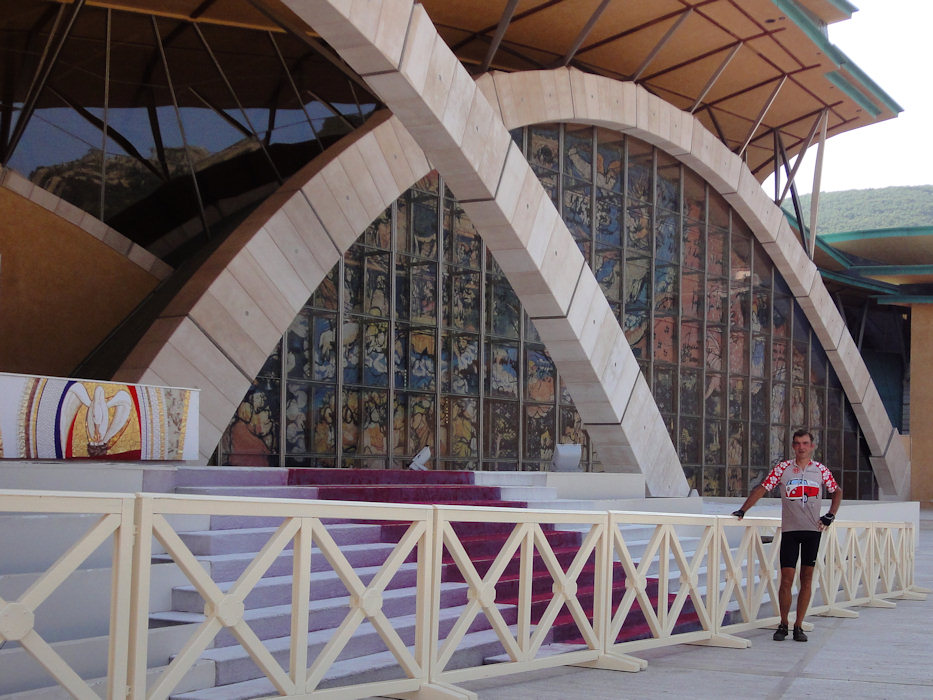 Ich erkenne, dass das Padre Pio Zentrum am oberen Ortsrand liegt und da ich von oben komme, besichtige ich zuerst die riesige Gedenkkirche und schaue mir die Sache etwas genauer an.Leider ist alles in Richtung Osten gebaut und so kann ich spätabends bei heftigen Gegenlicht nicht wirklich gute Fotos machen. Da sollte ich morgen nochmal hin. Ich entdecke ein Pilgerinformationsbüro. Interessant. Da kann ich ja mal nach einem Hotel fragen.