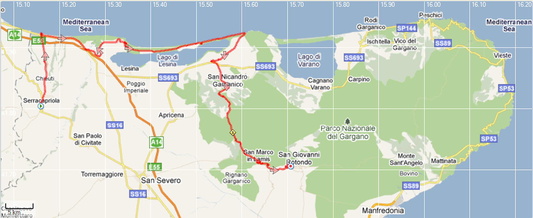 Zum Schluss noch ein Kartenausschnitt der heutigen Tour. Der Bildausschnitt zeigt den Sporen von Italien, die rote Linie meine heutige Strecke. Morgen will ich nach rechts bis zum Monte Sant Angelo, dann nach oben bis nach Peschici und dann ganz nach Osten, nach Vieste. Am Mittwoch fahre ich dann der Küste entlang bis nach Manfredonia, wo ich Freunde treffen werde und hoffentlich endlich mal im Meer bade gehe. GPS-Koordinaten oder Google-Earth was auch immer für Punkte kann sich jeder selbst heraussuchen. Dafür fehlt mir die Lust und die Zeit. A propos Google Earth: Die Kirchenanlage von Padre Pio ist in Google Earth dreidimensional dargestallt. Das war´s für heute. Das GPS sagt: 112 km., 6:26 Std., 1´000 Hm.
