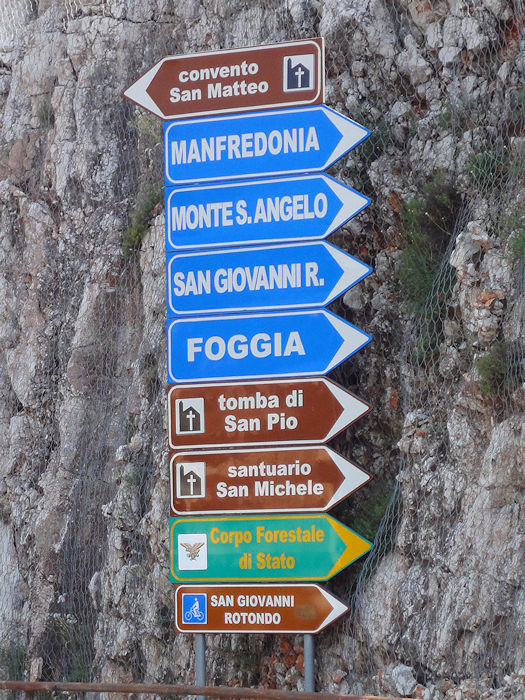 Es geht nochmals ein kleines Stück berghoch, wo ich die nebenstehende Schilderkombination entdecke. Das unterste Schild fand ich am interessantesten. Es kann doch nicht sein, dass die hier einen 20 Kilometer langen Veloweg bauen - unmöglich! Und siehe da, nach etwa 50 Meter fahre ich über den Hügelrücken und sehe vor mir, etwas weiter unten an der Hügelflanke San Giovanni Rotondo. Das ist ja sehr cool. Von San Marco bis San Giovanni sind es insgesamt kaum 10 Kilometer und in San Giovanni Rotondo gibt es über 100 Hotels.