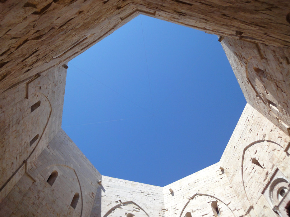 Das achteckige Castel del Monte kann man dann schon von weitem sehen, da es, wie der Name ja schon sagt, zuoberst und ganz alleine auf einem Berg steht. Mit dem Velo konnte ich an allen Parkplätzen vorbei und bis direkt vor den Eingang des Kastells fahren. Da waren dann auch schon andere Touristen und warteten darauf, dass die Türen zur Besichtigung geöffnet wurden. Ich setzte mich in den Schatten, genoss die tolle Aussicht und ass etwas Obst. Obwohl ich den Eintrittspreis von 6.50 ‚¬ etwas happig fand, wollte ich mir die Besichtigung natürlich auch nicht entgehen lassen.
