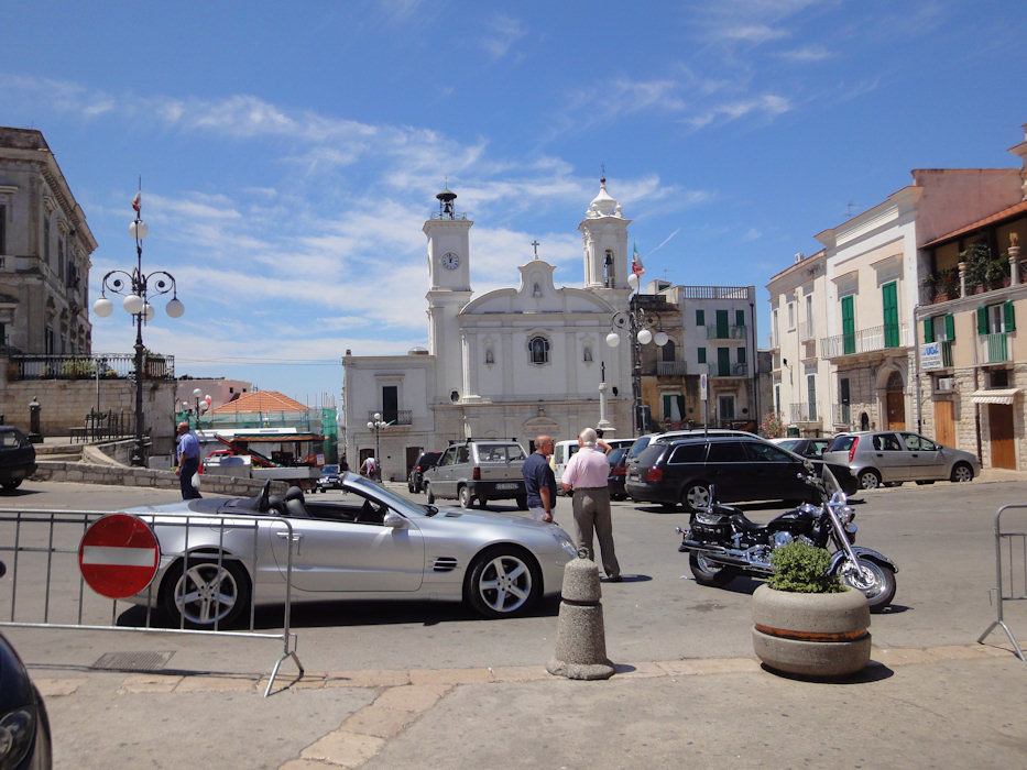 Es wunderte mich deshalb auch nicht, dass ich an grossen Windenergieanlagen vorbei kam. Nach etwa dreissig grossen Windrädern habe ich aufgehört zu zählen auch weil ich sah, dass es entlang des nächsten Hügelzugs genau so weiterging. In "Minervino Murge" machte ich eine Verpflegungspause und machte ein Foto von den zwei lokalen Don. Der Eine mit dem Mercedes SL500 Cabriolet und der andere mit einer fetten Harley...