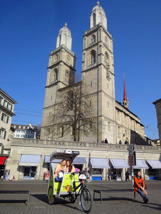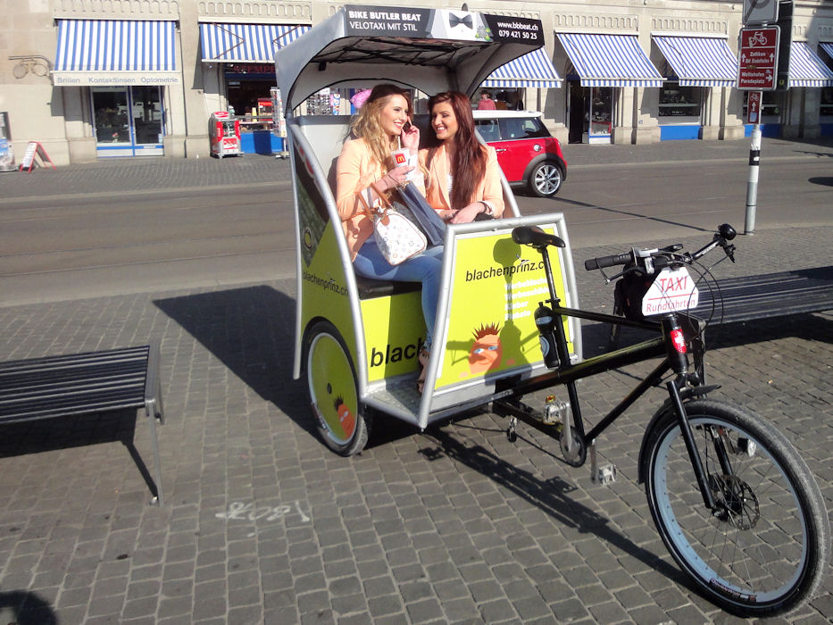 Heute Montag war es noch einmal richtig schön sonnig und auch angenehm warm. Ideal also um sich mit der Rikscha etwas durch die schöne Stadt Zürich fahren zu lassen. Dies dachten sich auch diese zwei jungen Frauen, die heute nun schon zum dritten Mal mit mir gefahren sind und sichtlich Spass an der Sache haben.