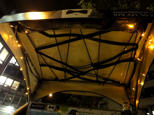 Heute wurde an der Bahnhofstrasse in Zürich die Weihnachtsbeleuchtung für 2012 erstmals eingeschaltet. Da wollte ich natürlich nicht hinten anstehen und montierte deshalb auch eine kleine Weihnachtsbeleuchtung unters Dach meiner Rikscha.