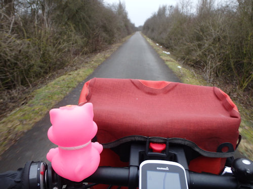 Heute war ich um 14 Uhr mit Lothar in Bad Bentheim verabredet. Ich hatte also vorher genug Zeit um mir noch etwas die Gegend anzusehen. Ich entschied mich für einen Abstecher nach Rheine, danach nach Salzbergen und von da nach Bad Bentheim. Etwas über 40 Kilometer, das geht locker. Von Wettringen bis in die Innenstadt von Rheine konnte ich auf einem Bahndammradweg fahren. Eine frühere Eisenbahnstrecke wurde hier zu einem Super-Radweg ausgebaut. Das ist hier die Luxusklasse der Radwege. Feinster Teerbelag, keine 10 Jahre alt, keine scharfen Kurven und nur unmerkliche Steigungen oder Gefälle. Wahre Rennstrecken (zumindest zu dieser Jahreszeit), auf denen man aber auch nur ganz locker cruisen kann. Es rollt wunderbar leicht.