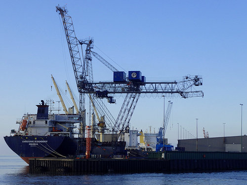 Auch heute war es wieder recht angenehm. Höchsttemperatur etwa 10° Grad, Durchschnittstemperatur unterwegs etwa 5° Grad plus. Kurz nach Nordenham kam ich zur Fähre über die Weser nach Bremerhaven. Mittlerweile war es etwas nach zwei Uhr mittags und die Sonne schien nun tatsächlich. Genau richtig! Schon von weit her sah ich Teile des Hochseehafens und diesen wollte ich nun noch etwas erkunden. Ich fuhr also so nah wie möglich an die grossen Schiffe und das Containerterminal heran. Natürlich ist vieles abgesperrt und man kann (leider) nicht direkt an den Hochseeschiffen, den riesigen Kränen und den Containerstapeln entlang fahren. Wäre ja auch zu schön gewesen. Mir hat es trotzdem mächtig Eindruck gemacht und deshalb gab es noch einige Fotos.