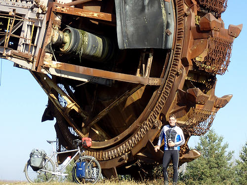Danach folgten ein paar langweilig flache Kilometer und schon bald kam ich nach «Ferropolis – eine Stadt aus Stahl». Das Ganze liegt auf einer Landzunge, umgeben von einem künstlichen See, welcher früher eine Braunkohle-Tagbau-Grube war. Zur Besichtigung muss man sechs Euro bezahlen und für einen zusätzlichen Euro kriegt man noch einen Audioguide, der einem alle Maschinen und die dazugehörigen Bauten und Hallen erklärt. Führungen gibt es nur im Sommer. Nur zwei der fünf Maschinen wurden auch hier eingesetzt. Die anderen drei wurden aus anderen Baugruben hierher befördert (man fragt sich wie).