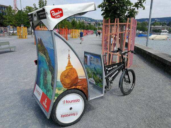 Ich konnte mit dem Reisebüro Tourasia einen langfristigen Werbepartner gewinnen. Nachdem wir schon Anfang Jahr zusammengearbeitet haben, sind wir jetzt zu einer Vereinbarung bis Ende nächsten Jahres gekommen. Das freut mich natürlich riesig, denn dadurch sind schon einmal ein paar Basiskosten gedeckt. Asien und Rikscha - das passt einfach gut zusammen. Zudem finde ich die Dekoration richtig schick. Es macht Spass, so durch Zürich zu fahren.