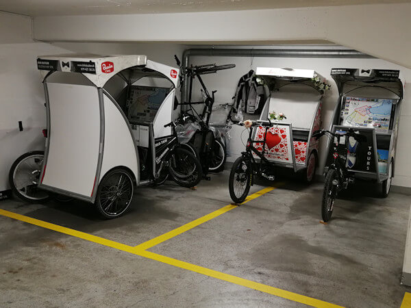 Seit Januar 2014 sind wir da eingemietet. Die Garage liegt strategisch gut, das passt soweit. Im Laufe des Jahres habe ich mit einem anderen Mieter gesprochen und ab Oktober werde ich nun den vorderen Parkplatz untervermieten. Die 4 Rikschas und mein Motorrad haben auf den verbleibenden zwei Parkplätzen genügend Platz. So kann ich ab nächstem Monat 1/3 der Mietkosten einsparen. Das ist gut so.