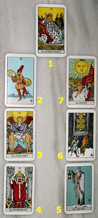 Sie haben sich Erfüllung oder die grosse Liebe versprochen. Zumindest sind Sie mit dem Herzen bei der Sache gewesen. Vielleicht haben Sie schon gespürt, dass damit für Sie eine wichtige Entscheidung verbunden ist. Karte Nr. 1 und Nr. 6 können Ihnen dazu aufschlussreiche Hinweise geben.