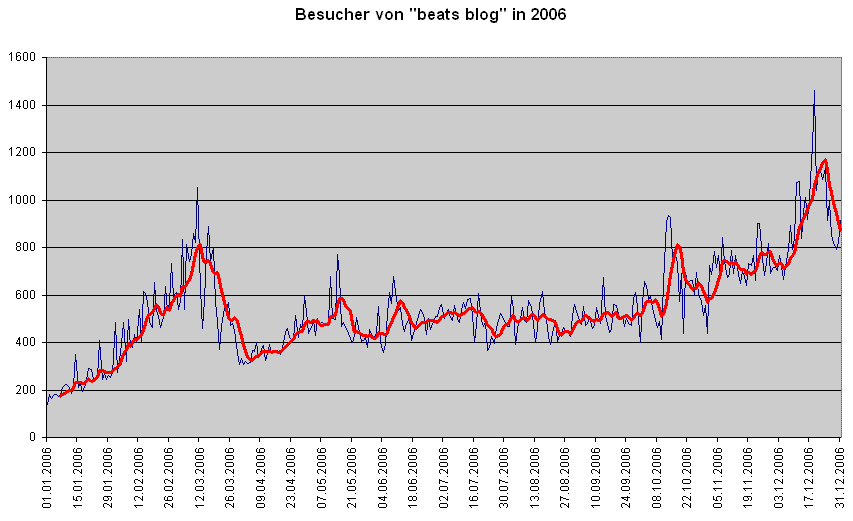 Links die Besucherstatistik meines Blogs im Jahr 2006. Nach einer ersten Spitze Ende März brach das Interesse erstmal ein und über die Sommermonate pendelten sich die Besucherzahlen ziemlich gleichmässig um die 500 pro Tag ein. Mit der kalten Jahreszeit und mehr Zeit vor dem PC stieg nun das Interesse gegen Ende Jahr deutlich an. Rekordtag war der 19.12. mit 1'403 Besuchern. Auch wenn die meisten Treffer durch künstliche Besucher entstanden sind (Suchmaschinen, Roboter), so bleiben immer noch viele echte Menschen, die diese Zeilen hier lesen. Das ist doch schon ganz schön und freut mich wirklich. Danke dafür.