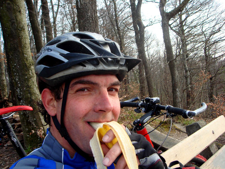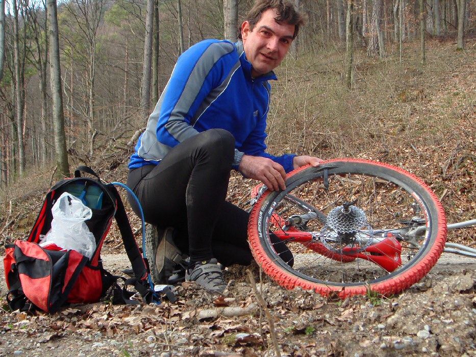 Die Tour verkürzte sich durch den ersten Plattfuss 2007. In einer Waldabfahrt bohrte sich ein Dorn in den hinteren Reifen was mir einen zweiten Halt bescherte. Nochmals eine Gelegenheit, mit dem Selbstauslöser der Digitalkamera rumzuspielen