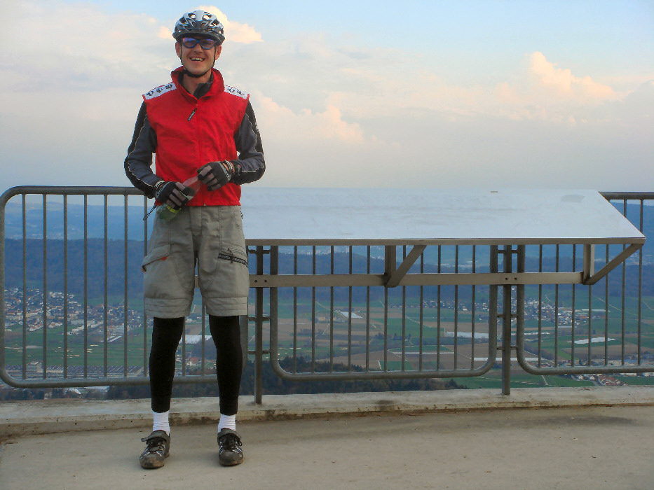 Auf dem Anstieg haben wir noch etwas gequatscht, doch wir hatten gut Druck auf dem Pedal und haben die 450 Höhenmeter Steigung zügig gepackt. Erstmals fühlte ich einen gewissen Trainingsfortschritt - cool. Oben auf der Aussichtsplattform noch ein Bild von Thomas für den Blog geknipst und schon bald ging's bergab mit uns