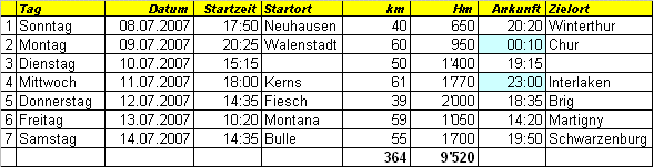 Am Montag und am Mittwoch muss ich wohl Beleuchtung mitführen. Nur am Freitag starte ich am Vormittag. Meistens starte ich am späten Nachmittag.