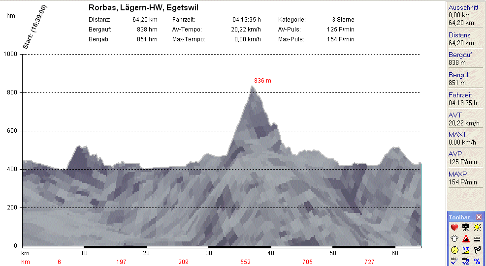 Auf dem Rückweg besuchte ich noch kurz meine Eltern und schon bald musste ich mich beeilen um noch vor Einbruch der Dunkelheit heim zu kommen. Der Tacho sagt: 64 km., 3:12 Std., 920 Hm.