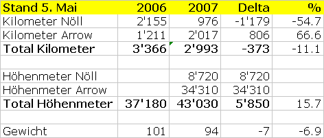Natürlich sind die -11% der Kilometer nicht wirklich gut und entsprechen nicht meinen Vorsätzen für 2007 (+10%). Beim zweiten Mal hinsehen fällt jedoch schnell auf, dass dies daher kommt, dass ich viel weniger auf der Strasse (mit dem Nöll S6cross) unterwegs war als 2006. Dafür war ich mehr mit dem MTB unterwegs (mit dem ARROW) und das zeigt sich dann auch in den 15% mehr Höhenmetern. Ich selbst denke, dass ich in gleicher Form bin wie letztes Jahr. Die rund 7 Kilo weniger Gewicht haben mich berghoch vermutlich etwas schneller gemacht. Klar könnte es mehr, oder besser sein, doch ich bin eigentlich zufrieden. Wenn ich mich bis zum Gigathlon nicht verletze, sollte ich die 7 Tage Belastung dann schon schaffen.
