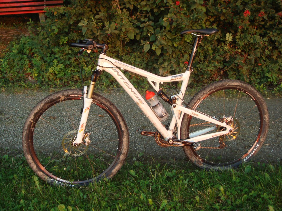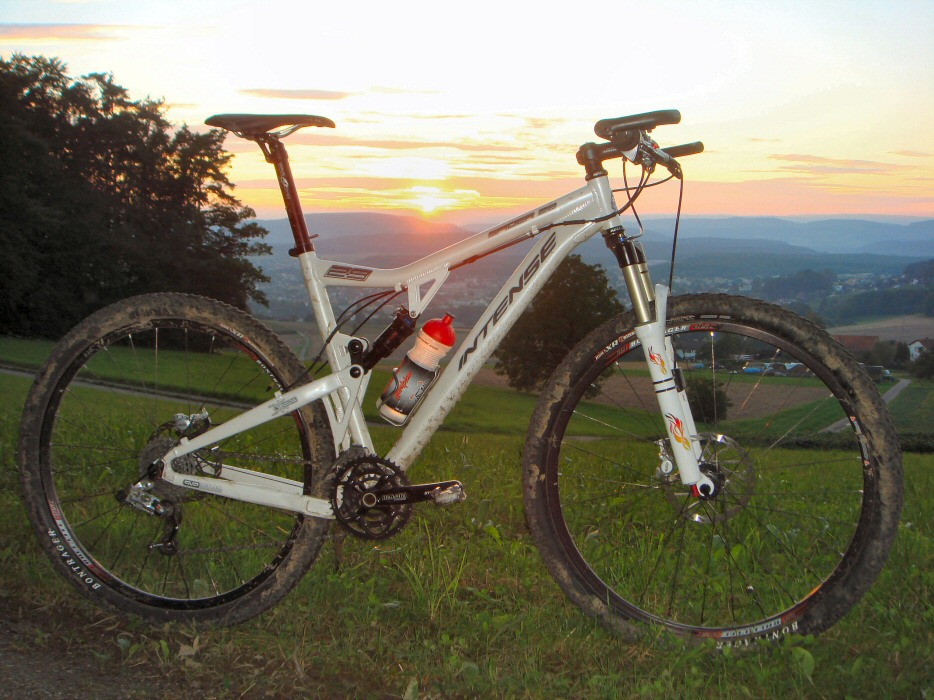 Heute abend fuhr ich das INTENSE noch etwas spazieren. Herrliche 26° Grad, Sonnenschein. Der ideale Abend für eine Fotosession. Ich radelte ganz gemütlich durch die Gegend. Das Bike fährt sich wirklich Klasse. Die hintere Federung ist nun super aktiv und trotzdem wippt da nichts. Wenn ich berghoch die Vordergabel blockiere und in den Wiegetritt übergehe, fährt es sich fast wie ein Hardtail.