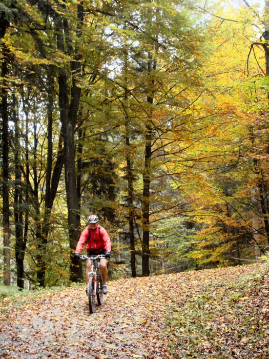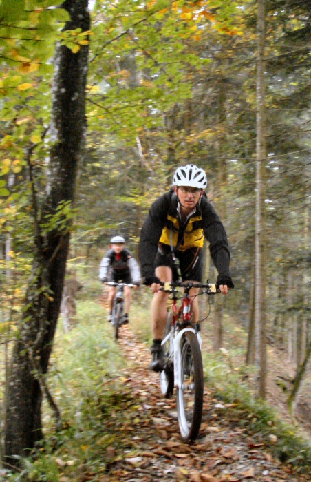 Heute entsprach der GPS-Track sehr gut unseren Vorstellungen, denn nach der Steigung folgte ein Singletraildownhill vom Feinsten. Anfangs noch etwas flach, doch dann wurde der Weg stetig steiler und fast zuunterst mussten wir auch ein- zweimal absteigen, weil Bäume im Weg lagen. Der Boden war noch ziemlich feucht und stellenweise recht rutschig, die Reifen füllten sich rasch mit Dreck. Da war gute Fahrtechnik gefragt.