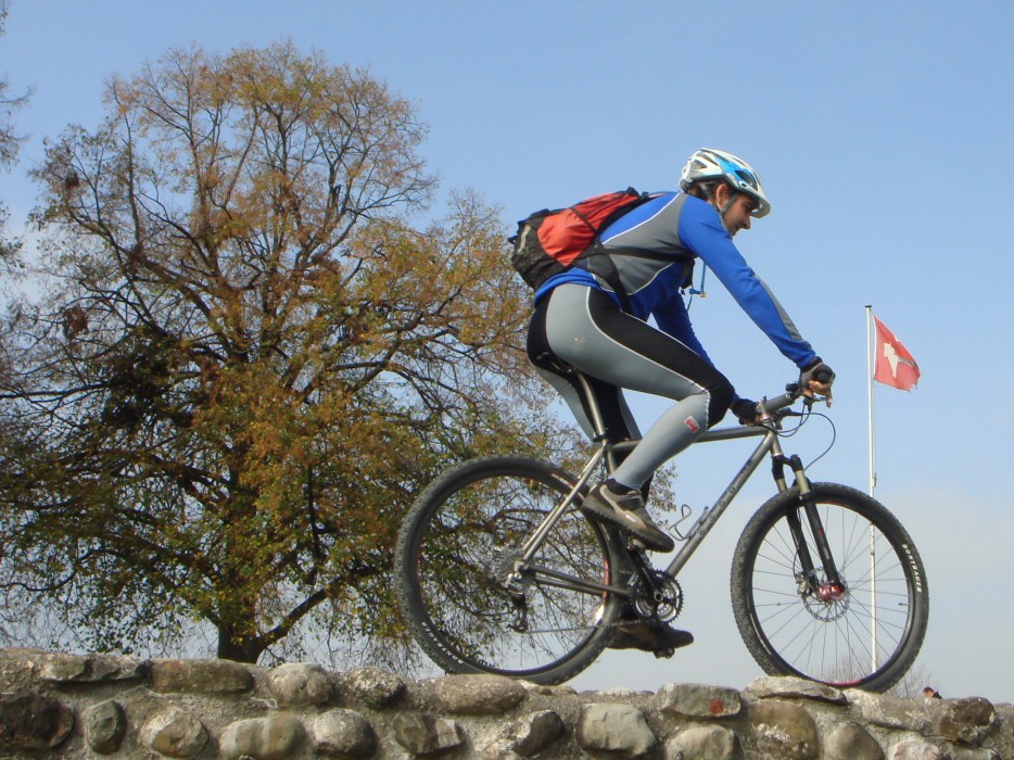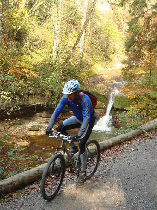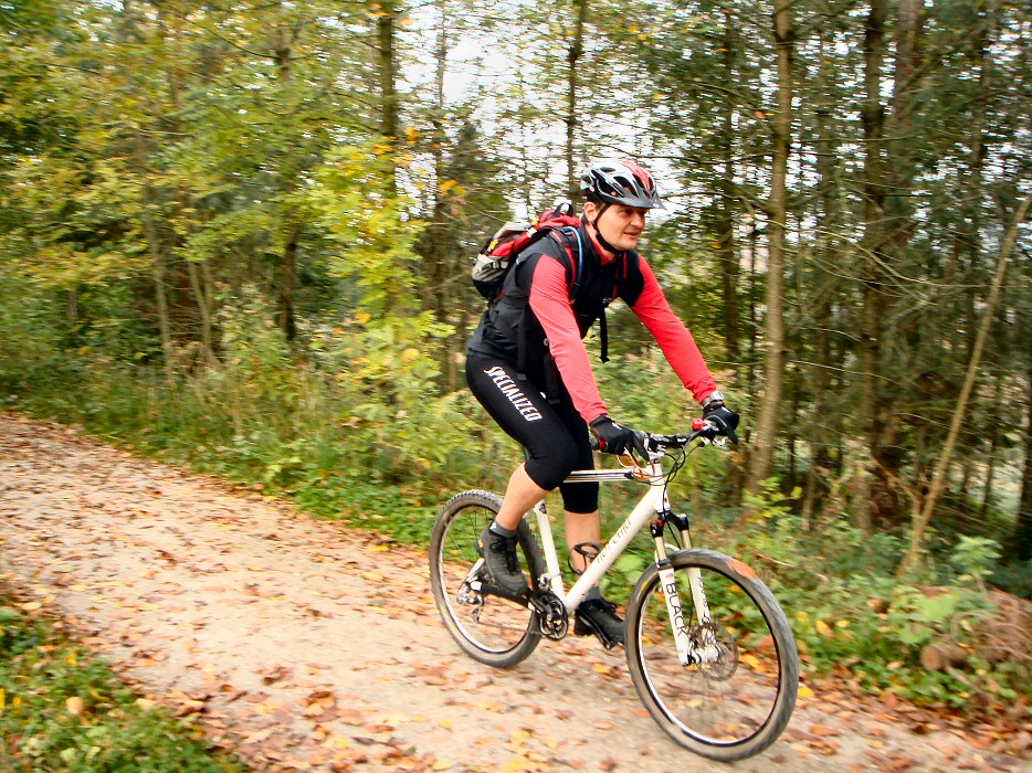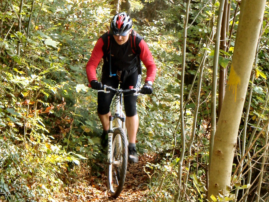 Ich war eher zu warm gekleidet, denn im Laufe des Nachmittags wurde es bis zu 18° Grad warm und da war lang/lang etwas viel. Berghoch schwitzte ich deshalb kräftig. Das Wetter war schöner als erwartet. Wir fuhren unter dichtem Hochnebel los, doch je länger der Mittag, desto schöner das Wetter. In den Wäldern zeigte sich ein wundervolles Farbenspiel. Schon sehr viele Blätter sind gefallen. Es riecht auch nach Herbst. Schön. Sehr schön. Gestern sagte Thomas während der Tour, dass unsere Umgebung wie ein grosser Spielplatz für Mountainbiker sei und heute musste ich wieder einmal mit einem Lächeln daran denken. Das hat etwas.
