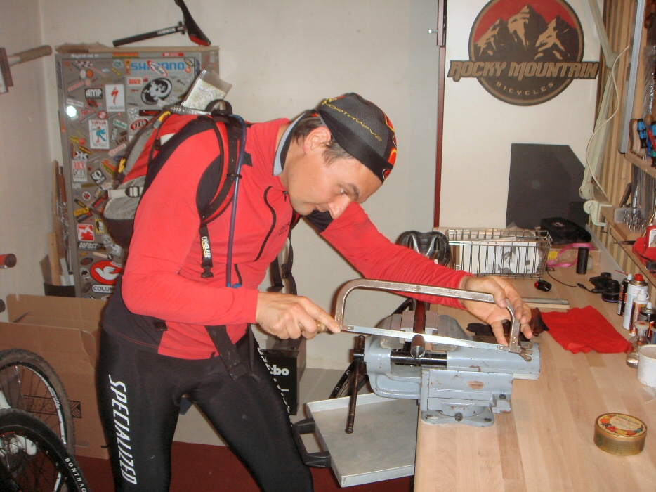Heute traf ich kurz nach Mittag Peter in Uster und wir wollten eine eher flache Sonntagstour fahren. Ich hatte das KISH mitgenommen und als mir Peter seine gut eingerichtete Werkstatt zeigte, ergriff ich die Gelegenheit. Die neue Sattelstütze musste noch etwas gekürzt werden und Peter wollte das gerne für mich erledigen. Das sah Spitze aus. In Bikekleidern, mit Rucksack und Bandana