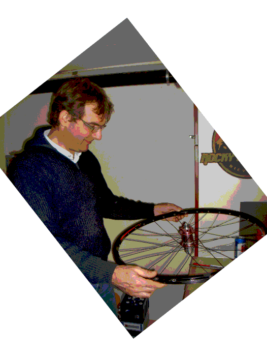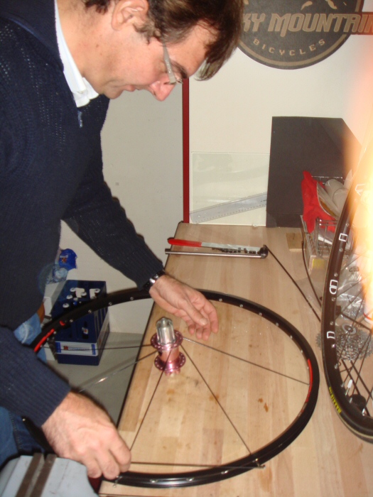 Heute abend zeigte mir Peter, wie man ein Laufrad richtig einspeicht. Nach der Theorie (die er mir mehrfach erklären musste, bis ich's halbwegs begriffen habe) ging es dann gleich zur Praxis über.