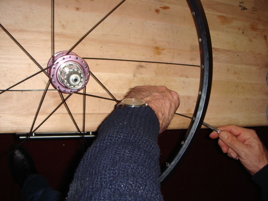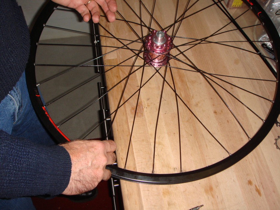 20. Laufrad zwischendurch aus dem Zentrierständer nehmen und Abdrücken. Dafür Nabe auf ein Holzbrettchen stellen, Laufrad waagerecht ausrichten und mit den Händen an gegenüberliegenden Seiten der Felge nach unten drücken. Dadurch werden die Speichen auf der Unterseite leicht entlastet und eventuell tordierte Speichen drehen sich zurück. Hinweis: bei einem gut gemachtes Laufrad kann man sich sogar auf die Felge stellen und auf der Nabe balancieren! Achtung: diese extreme Belastung kann die Lagerung beschädigt werden.