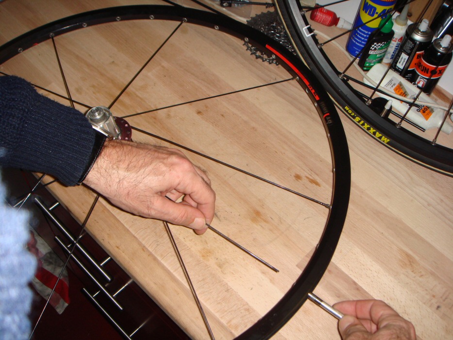 19. Speichenspannung möglichst gleichmässig erhöhen bis Drehmoment mit den Fingern kaum noch aufzubringen ist. Keine Sorge: der Stahl für die Speichen ist der mit grossem Abstand Wertigste am gesamten Fahrrad. Und: Stahl bricht um ein Vielfaches schneller, wenn er einer wechselnden (bei geringer Speichenspannung) statt einer schwellenden Last (bei hoher Speichenspannung) unterworfen ist. Kontrollieren, ob der Nippel wirklich auf der Speiche dreht, oder die Speiche tordiert wird. Ggf. Speiche mit einer glatten Zange festhalten.