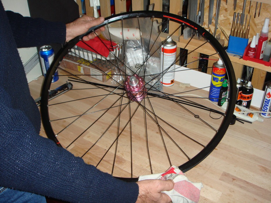 Es hat Spass gemacht, doch ohne Anleitung könnte ich das nicht wiederholen. Das Zentrieren zum Schluss hat dann Peter übernommen und es war ein echter Genuss ihm zuzusehen. Man spürt, dass er das gerne macht, gut kann und sich darin ein Stück weit vergessen kann. Klopft er an die Speichen -um an deren Klang die Spannung zu vergleichen- huscht ein Lächeln über sein Gesicht. Schön. Dieses Lächeln übertrug sich zum Schluss dann auch auf mich, als ich das fertig aufgebaute Rad in Händen hielt. Es war schon gegen halb zwölf Uhr nachts als wir mit dem letzten Schluck Bier auf das gelungene Resultat anstiessen. Das war ein wirklich gelungener Abend. Danke. ![]()