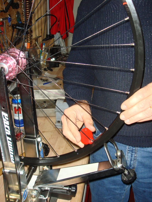 16. Nun mit einem guten Speichenschlüssel (z.B. Pockey, Park Tool; umfassen den Speichennippel auf drei Seiten) Speichenspannung gleichmässig erhöhen. Laufrad dafür in einen guten Zentrierständer (Referenz: Park Tool!!) fixieren.