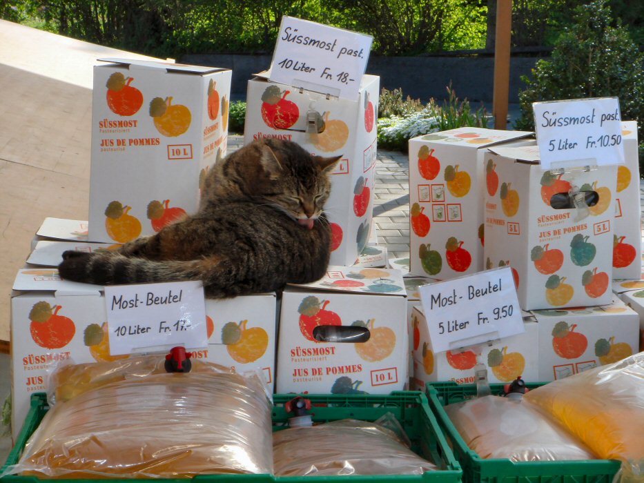 Ich entschied schon bald, dass ich nicht mit dem Auto, sondern mit dem KISH Titanrad da hinfahren werde. Deshalb musste ich für den Rückweg die Beleuchtung und zusätzliche Kleider einpacken. Die Hinfahrt, abends um 17:00 Uhr, sonnig, ~22° Grad warm, war dann ein reiner Genuss. Ich fuhr absichtlich langsam um nicht stark zu schwitzen, ich wollte später am Tisch ja nicht gleich übel nach Schweiss riechen. Die Natur ist jetzt so üppig, das Gras so grün, der Raps so gelb, die jungen Buchenblätter so saftig grün... herrlich. Bei einem Obstbauer machte ich kurz Halt um mir einen Apfel zu kaufen. Soviel Natur macht richtig Lust zum dreinbeissen.