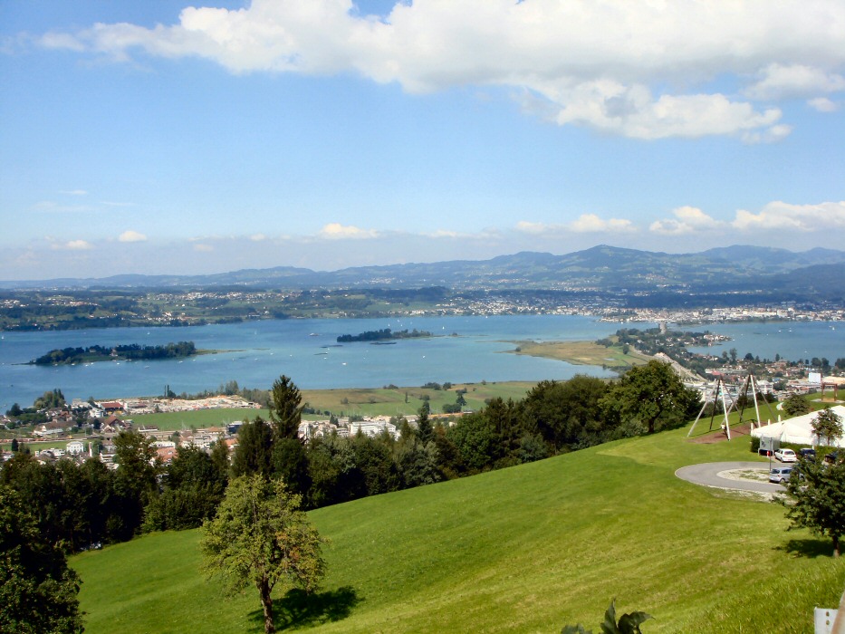 Der Rückweg war dann nicht mehr schwer. Ein kurzer Anstieg auf den Etzel war noch das einzige Hindernis. Auf der Abfahrt runter zum See, machte ich noch dieses Foto. Es zeigt links den Zürichsee mit den Inseln Ufenau und Lützelau, den Seedamm von Pfäffikon nach Rapperswil und rechts den Obersee. Eine wirklich schöne Aussicht. Unten, dem See entlang und über den Seedamm war dann noch ziemlich viel Verkehr und man musste ziemlich aufpassen. Autos, andere Radfahrer, Wanderer, Hunde, Lichtsignale, Kreisverkehr. Das mag ich nicht an Strassenrunden, lässt sich jedoch nur schwer vermeiden. Der Tacho sagt: 66 km., 3:17 Std., 1'120 Hm.