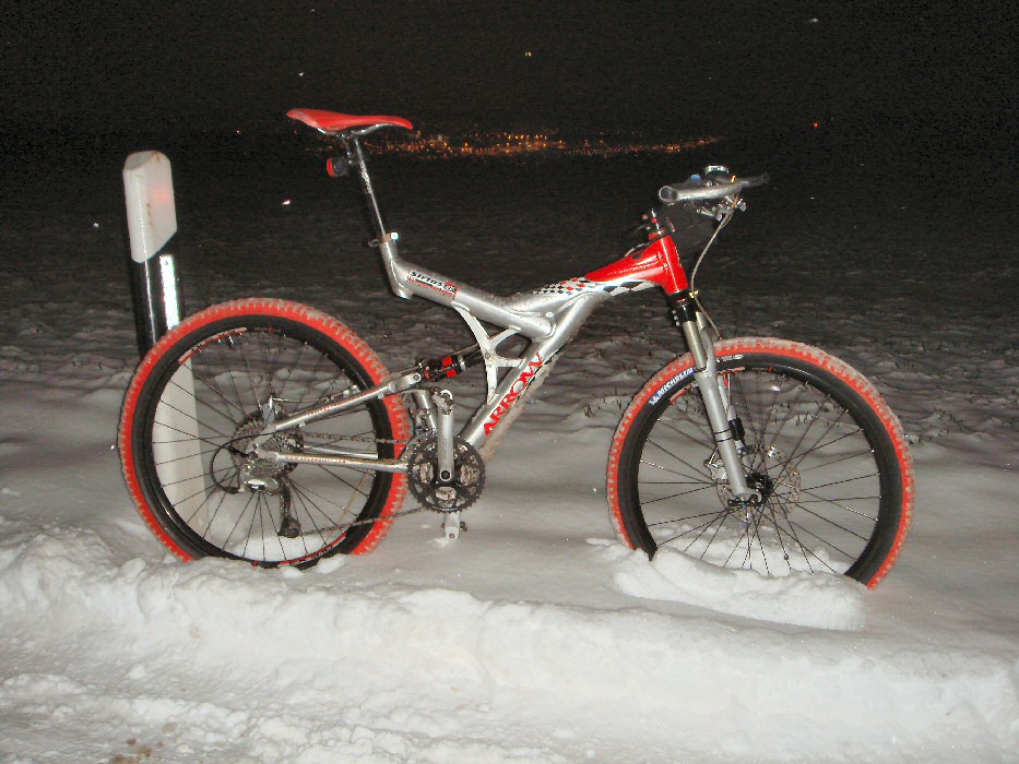Abends auf der Heimfahrt schneite es dann ganz leicht und eine steife Brise wehte mir entgegen. Der Bikecomputer mass minus 4 Grad doch -wie heisst dieses Ding?- der Chillfaktor liess das Ganze kälter anfühlen. Trotzdem wollte ich am höchsten Punkt meiner Fahrt kurz halten und ein Foto schiessen. Es ist die gleiche Position wie am Montag... diesmal einfach mit Schnee.