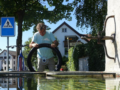 Dort machten wir dann eine längere Pause und genehmigten uns in einem Strassencaffé ein gutes Mittagessen. Im Gespräch entschieden wir uns, das Küsnachtertobel auch wieder nach oben zu fahren, um noch ein paar schöne Fotos zu schiessen. Die Bilder die ich hier zeige, die gefallen mir auch wirklich sehr gut, dennoch bin ich nicht ganz zufrieden, weil doch einige Bilder nicht wirklich scharf sind. Im Bild links sieht man Peter auf einem schmalen Trail. Das Bild rechts, mit dem Wasserfall, finde ich aber absolut gelungen. Vorne fährt Matthias, ich dahinter.